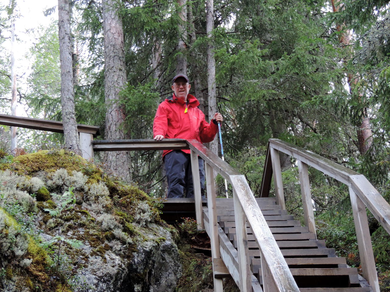 Bald fing dann auch der Koli-Nationalpark an, leider auch wieder starker Regen. Wir hatten den Tip bekommen, daß es hier eine Höhle geben soll, Teufelskirche genannt. Wir haben sie tatsächlich gefunden. Nachdem wir im Auto unsere Brote gegessen hatten, hörte der Regen auf, und wir konnten zur Höhle gehen. Etwas anstrengend, aber sehr schön. Zuerst ging es über einen kleinen Berg und dann lange Holztreppen wieder hinunter, die wir auf dem Rückweg wieder hinauf mußten. Der Eingang war sehr klein und wurde zusätzlich durch einen kugelrunden Stein eingeengt. Dann ging es ein ganzes Stück durch einen schmalen Gang in den Berg. Es gab noch einen Durchbruch, durch den das Tageslicht in die Höhle fiel, aber keinen weiten Höhlenraum. Nach dem langen Aufstieg über die Treppen kamen wir zurück zum Auto.