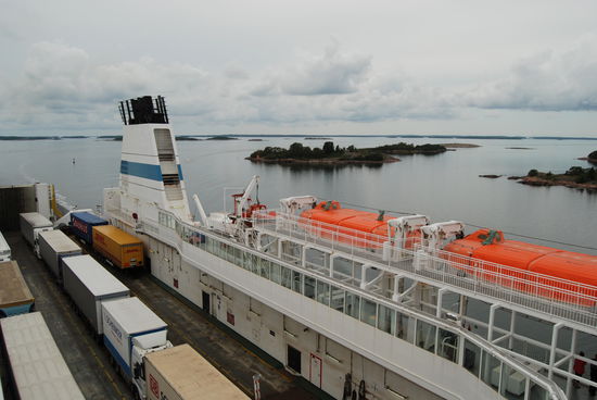 Nach einer ruhigen Nacht standen wir um halb 8 Uhr auf und fuhren Punkt 8 auf die Fähre. Wir hatten eine tolle Kabine erwischt, mit Blick direkt nach vorn. Aber erst einmal gab es Frühstück. Bei dieser Finnlines-Fähre gehören zwei Mahlzeiten bei der Überfahrt dazu. Zwischenzeitlich legte im Fährbett nebenan die Vikingline-Fähre Rosella an.