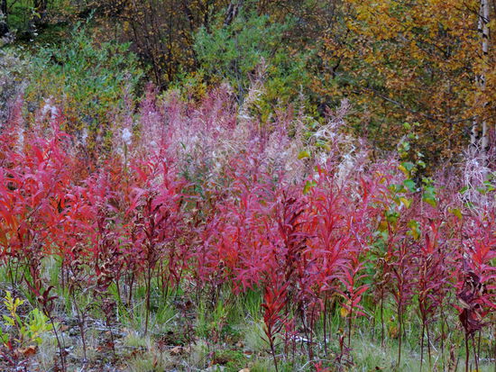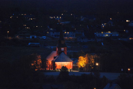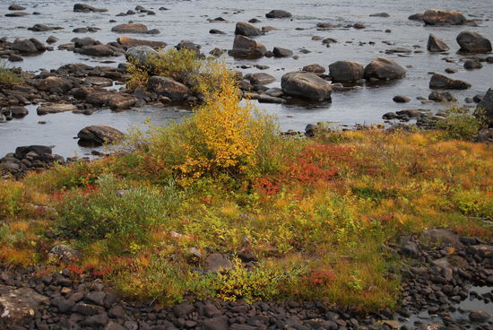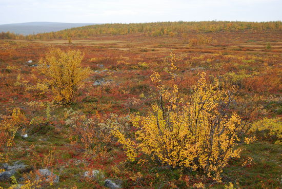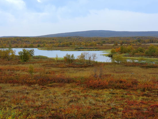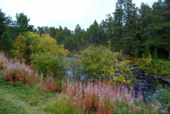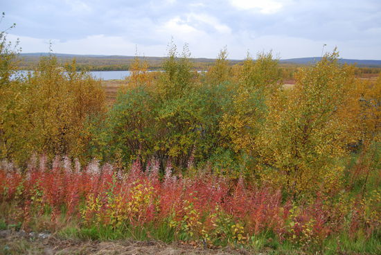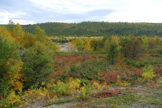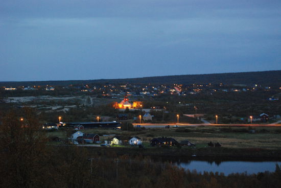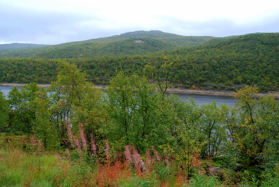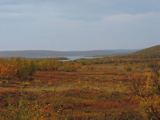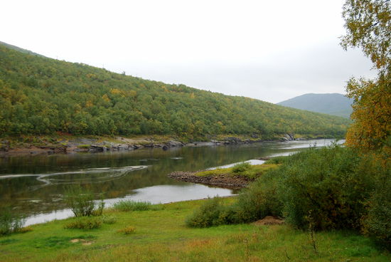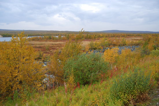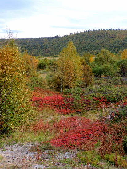 Beim Aufstehen um 9 Uhr war es wieder vorbei, und das Thermometer zeigte 14° an. Heute fuhren wir über die Brücke, auf der auch die Grenze verläuft, nach Norwegen. Die Straße führte uns immer am Teno entlang. Wir waren begeistert über die Ursprünglichkeit dieses Flusses. Es gab sehr viele Sandbänke, die mal rechts-, mal linksseits lagen. Ruhige Fließstellen wechselten mit Stromschnellen ab. Streckenweise lagen viele große Steine im Flußbett. So schlängelte sich der Fluß viele Kilometer dahin, und die Straße folgte ihm. Durch den Frost hatten sich die Blätter noch mehr verfärbt. Es war ein wahrer Traum. Langsam ging es hinauf aufs Fjäll. Hier gingen die Farben langsam in ein gelb-braun über, und auch das Rot wurde fast zu einem Violett. Immer wieder hielten wir an. Mal war es ein Moor, mal ein See oder ein Bach, der festgehalten werden sollte. In Karasjok machten wir Kaffeepause und gingen noch in den dortigen Sameladen. Hier konnte man einer Glasbläserin bei der Arbeit zusehen, und auch ein Silberschmied war am Arbeiten. Aber lange konnten wir uns nicht aufhalten. Uns fiel auf, daß sehr viele Wohnmobile und Wohnwagen auf dieser Strecke unterwegs waren. Vielleicht gab es hier ja auch so etwas wie Herbstferien. Nebenbei, die Straße war über die ganze Strecke recht gut, aber auch schmal. Ab der Straßenkreuzung nach Alta wurde sie dann zweispurig. Schade, daß es fast nur bewölkt war und die Berge dadurch im Dunst lagen. Gegen 20 Uhr kamen wir in Kautokeino an. Ein Schild zur Info mit Parkplatz verstanden wir falsch und gerieten so auf eine kleine Landstraße, auf der ein Wenden unmöglich war. So mußten wir mehrere Kilometer fahren, bis endlich Häuser kamen, wo wir wenden konnten. Zurück auf der Hauptstraße fanden wir dann ein Schild mit Wohnwagen-Zeichen und Kaffee. Auf dem Weg dorthin gab es einen größeren Platz, auf den wir uns stellten, in der Hoffnung, nicht vertrieben zu werden. Von dort hatten wir einen tollen Blick über die Stadt.