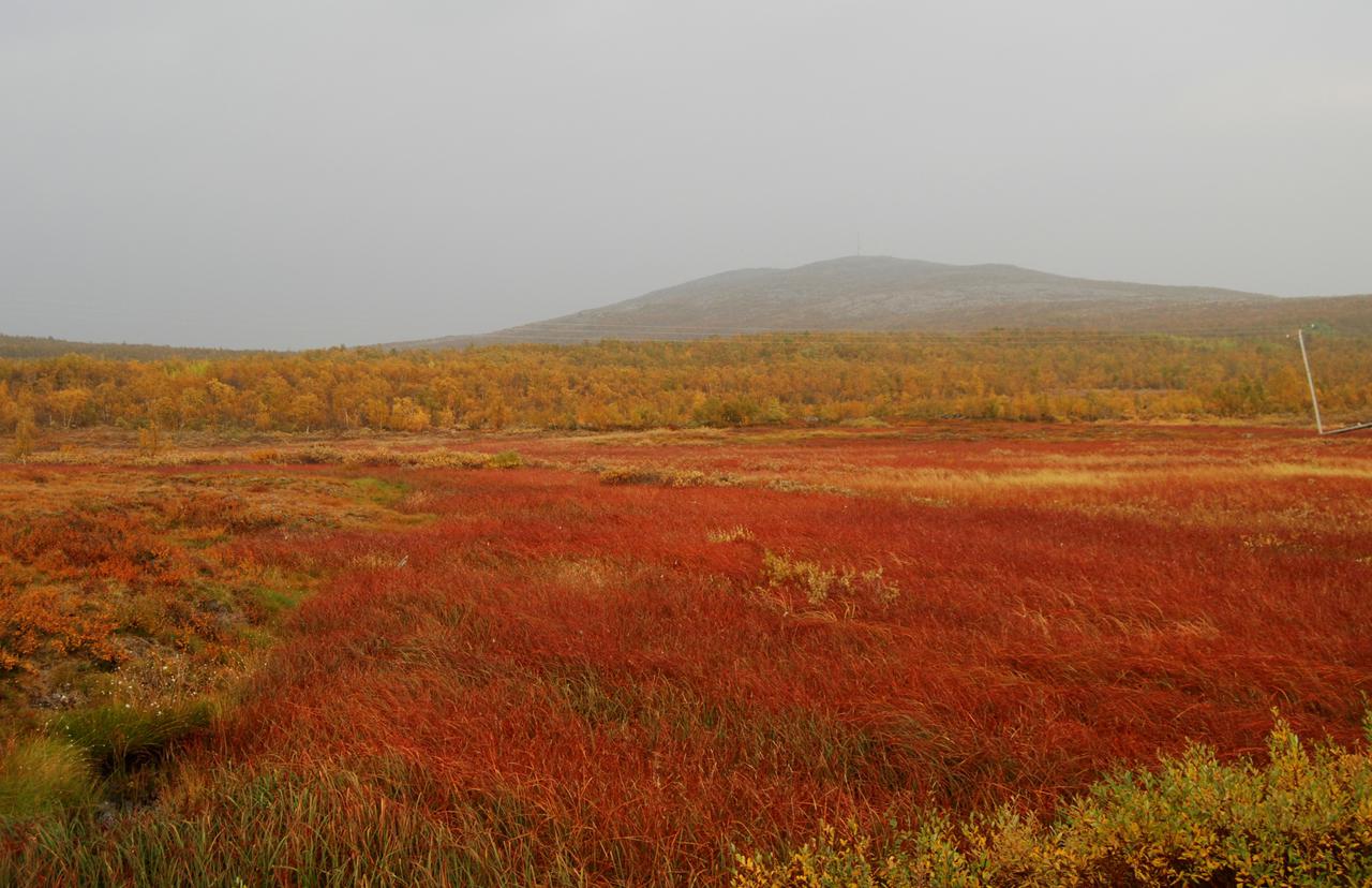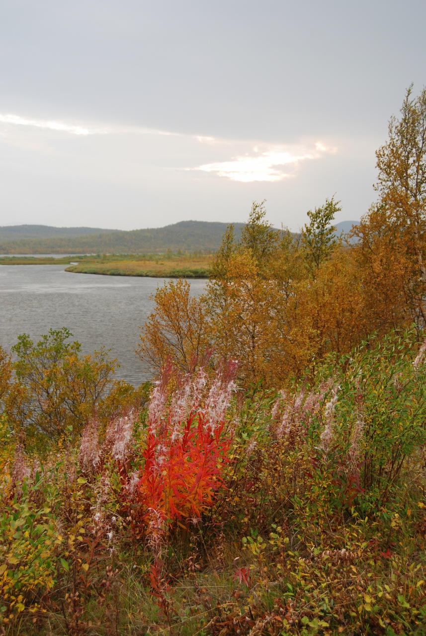 Nach einer ruhigen Nacht besuchten wir einen Silberschmied. Schon das Haus von außen war eine Überraschung. Hier hatte sich ein Künstler verewigt. Kaum gerade Wände, alles geschwungen oder gewölbt. Viele verschiedene Materialien harmonisch vereint. Einfach fantastisch. Als Blickfang vor dem Haus ein riesiges goldenes Ei aus Mosaiksteinen. Als erstes betritt man die Werkstatt mit ca. 12-15 Arbeitsplätzen. Hier konnte man zusehen, wie einzelne Schmuckstücke bearbeitet wurden. Weiter ging es in den ersten Ausstellungsraum. Hier wurden viele samische Gegenstände und alter samischer Silberschmuck gezeigt. Anschließend ging es dann mit Ketten, Broschen und Ringen des Künstlers weiter. Ein Raum ging in den nächsten über. Es folgten Glas-, Holz- und Textilarbeiten. Alles von Samen hergestellt. Natürlich auch ihre schönen Schnitzerei aus Renhorn, Birkenholz usw. Aber auch zwei große Räume mit Teppichen aus Indien und Alpakabekleidung, worüber wir erstaunt waren, gab es. Wie wir später erfuhren, hatte der Künstler mit seiner Frau arabische Länder bereist. Wir lernten ihn durch Zufall kennen, ein alter Herr mit weißem Bart und Stock. Er erzählte uns in gutem Deutsch, daß er Däne ist und als junger Mann 1950 nach Kautokeino gekommen und geblieben war. Seine Frau war eine Deutsche und auch Künstlerin. Die Samen mit ihrer alten Kunst und Kultur hatten es ihm angetan, und er hat sie auch nach Kräften unterstützt. Nach diesem unerwarteten Erlebnis fuhren wir noch in der Stadt ins Samemuseum. Es ist nur eine kleine Ausstellung, aber trotzdem sehenswert. Gut auch, daß man eine deutschsprachige Broschüre bekam. Bis wir dann endgültig in Richtung Kilpisjervi in Finnland fuhren, war es schon früher Nachmittag. Die Strecke Unterschied sich nur unwesentlich von der gestrigen. Ab und zu mischten sich jetzt wieder Kiefern unter die Birken, und auffällig war, daß die Bäume sofort viel größer waren, wenn man auch nur 50 m tiefer kam. Es war furchtbar diesig, und manchmal waren auch sehr dunkle Wolken dabei, aber geregnet hat es nicht. An einer Stelle im Norden war ein Loch in der Wolkendecke, blauer Himmel und ein wenig Sonne lugten dort durch. Dabei blieb es aber auch. Die vielen Berge, die am Horizont auftauchten, blieben leider nur schemenhaft zu sehen. Die letzten Kilometer Straße wurden immer schlechter. Sie war leider sehr ausgefahren. Vielleicht lag es an den vielen Lastwagen, die von Norwegen kommend ständig an uns vorbeibrausten. Dann endlich das Ortsschild Kilpisjervi. Ich staunte nicht schlecht, Häuser wohin man blickte, ganze Blockhaussiedlungen, schöne Einfamilienhäuser, zwei Campingplätze mit vielen Hütten, eine Tankstelle und ein Supermarkt mit Schuh- und Bekleidungsgeschäft. Der Ort von damals war nicht wiederzuerkennen. Am Freitag erwartete der Campingplatz sehr viele Norweger. Sie hatten hier den halben Platz mit festen Hütten bebaut, vor die dann die Wohnwagen gestellt werden. Die Wintersaison ist hier die Einnahmequelle. Wir bezahlten 26,50€ mit El.