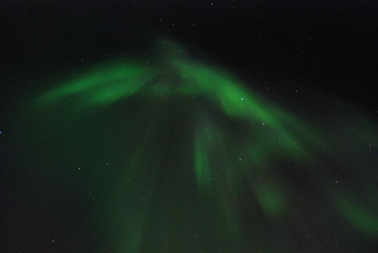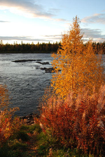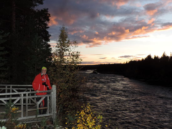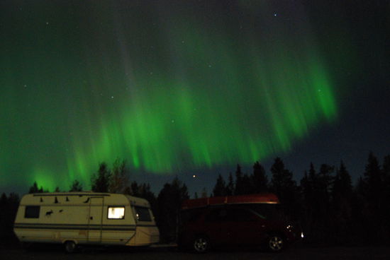 Einige Kilometer weiter wies ein Schild auf einen Parkplatz und Stromschnellen hin (Äijäkoski). Er lag ein ganzes Stück von der Hauptstraße entfernt, und so beschlossen wir, hier zu nächtigen. Ein Wohnmobil war schon da. Wir hofften sehr, daß es heute wieder Nordlicht geben würde, da es kaum Wolken gab. Tatsächlich, trotz des Mondes, der sehr hell schien, war das Nordlicht kurz nach Mitternacht gut sichtbar. Warm anziehen, es waren -2°, Stativ und Kamera geschnappt und raus ging es. Man mußte es gesehen haben, um zu verstehen, wie begeistert wir waren. Es war ein ständiges Kommen und Gehen, mal nur auf einer Seite, mal um den ganzen Himmel herum. Zeitweise fühlten wir uns wie in einer Samekota aus Nordlicht. Wenn man dachte, nun ist es vorbei, fing es an einer anderen Stelle neu an. 2 Stunden harrten wir aus, dann war der Nacken steif und die Füße kalt. Eine Sternschnuppe sahen wir auch noch. Ich ging dann schlafen, und Rainer sichtete noch das Fotomaterial und speicherte es ab.
