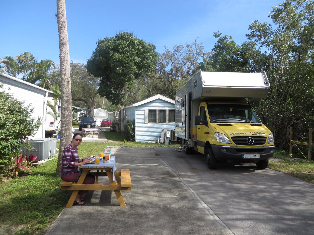 Heute fahren wir dann weiter, wir nehmen die 41 und kommen so durch kleinere Städte und es ist eigentlich ein ganz entspanntes Fahren, manchmal nerven die Ampeln. Dann geht’s auch wieder ein Stück auf der Autobahn Richtung Fort Myers. Weiter geht’s auf die Insel zum Fort Myers Beach. Heute scheint wieder die Sonne, aber es ist sehr windig. In Fort Myers Beach kommen wir dann zu dem einzigen Campingplatz Red Coconut. Wir fragen und es gibt sogar noch einen Platz am Strand. Der kostet günstige 100 $, aber man gönnt sich ja sonst nichts. So stehen wir zwar in der zweiten Reihe, können aber trotzdem aufs Meer über den Strand blicken.