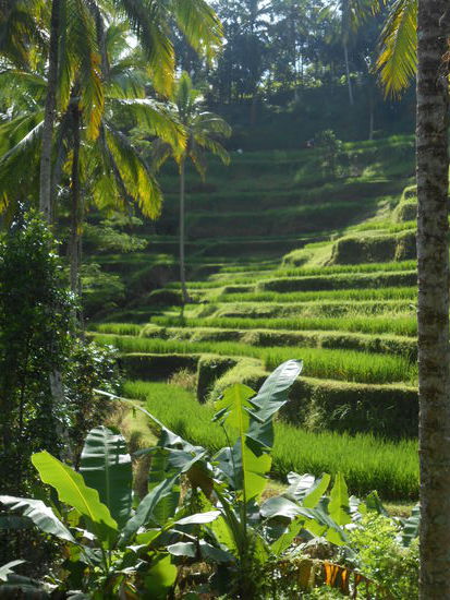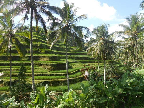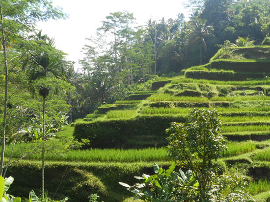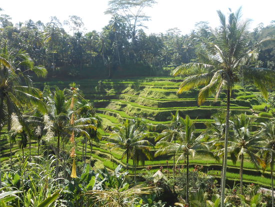 Ungefähr eine halbe Stunde von Ubud auf Bali entfernt liegen die berühmten Reisterrassen von Tegallalang. Der Blick ist atemberaubend - die Terrassen fallen sehr steil ab und bei blauem Himmel bietet sich ein toller Kontrast zwischem dem knall-grün der Terrassen und und dem Blau des Himmels.