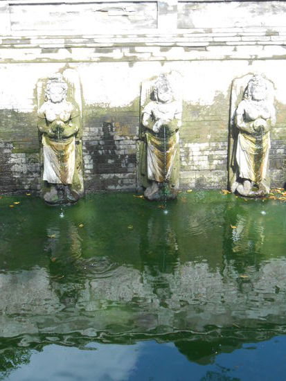 Einige Theorien gehen davon aus, dass die Dämonenfratze die Hilflosigkeit des Menschen gegenüber Göttern, Dämonen und Natur ausdrücken soll. Vielleicht wird auch der Riese Pasupati dargestellt, der einst den Berg Mahameru in zwei Teile spaltete und damit die beiden großen Vulkane Gunung Agung und Gunung Batur erschuf. Übrigens die Vorlage für das candi bentar, das sich in fast allen Tempelanlagen findet. Es könnte aber auch Boma sein, der Gott der Tore und Übergänge, Sohn der Götter Visnu und Basundari oder die Hexe Calon Arang, eine Figur aus der balinesischen Mythologie. Oder etwas ganz anderes und bislang völlig unbekanntes. Genutzt wurde die Höhle ebenso vielseitig, möglicherweise diente sie zunächst shivaitischen Eremiten als Mönchsklause, danach folgten vermutlich Buddhisten. Zumindest finden sich einige Buddhastatuen in und um die Höhle, sowie eine etwa 1000 Jahre alte Statue der buddhistischen Dämonen-Gottheit Hariti. Hindus waren ebenfalls dort, denn auch der hinduistische Gott Ganesha findet sich und die göttliche Trinität aus Brahmā, Visnu und Siwa. Offenbar koexistierten Buddhismus und Hinduismus damals friedlich nebeneinander.