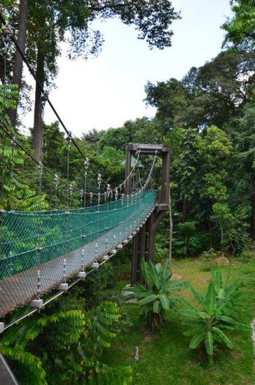 Hiernach besuchten wir noch einmal den Menara KL, den Fernsehturm. Von oben hat man einen fantastischen Ausblick über die Stadt. Der Eintritt sollte 105 RM p.P. kosten. Dieses Erlebnis hatten wir bereits vor 4 Jahren und waren nun nicht gewillt, die 22 Euro p.P. noch mal zu bezahlen. Stattdessen wollten wir durch den angrenzenden kleinen Park laufen. Als wir den Eingang zum Park passiert hatten, stellten wir erstaunt fest, dass in der Zwischenzeit offenbar ein Canopy Walk gebaut worden ist. Schau mal an! Den kannten wir noch nicht…….und endlich bekamen wir doch noch einen kleinen Canopy Walk!!