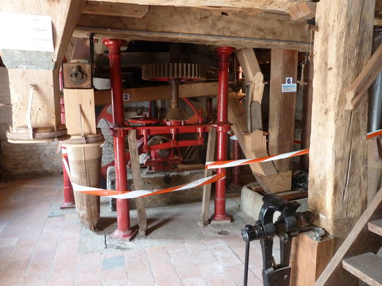 Von der Radachse wird die Energie auf ein großes Zahnrad übertragen, das das gesamte Mahlwerk antreibt: drei Paar Mühlsteine, ein Hebewerk und eine Staubabsaugvorrichtung mit externem Auslass an jedem Paar Mühlsteine.