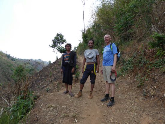 Wonna, unserem Guide, war dann viel zu heiß und wir mußten ihn dann etwas zum Weitergehen antreiben. Im ersten Palaung-Dorf waren sämtliche Einwohner auf einem Hügel bei einem riesigen Baum mit dem Bau einer neuen Pagode beschäftigt. Natürlich gabs von uns eine kleine Spende an den Dorfchef(?) und er versprach uns Glück, ... und alle lächelten uns zum Abschied freundlich zu.