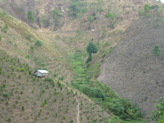 Die ca. 200 km lange Fahrt führte zuerst durch die heiße und trockene Ebene und dann kurvenreich hinauf in die Berge. Nach 6 Stunden Durchrütteln über holprige Straßen stiegen wir in Kalaw aus und wir konnten wieder richtig atmen. Angenehme 10° kühler!