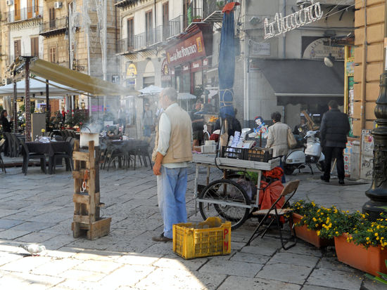Ute ist inzwischen an der Antica Focacceria San Francesco eingetroffen und „besetzt“ schon mal einen Tisch für uns drei im Außenbereich. Das schöne Wetter müssen wir ausnutzen. Anneken und ich wandern also über die heute stark belebte Via Roma, Via Vittorio Emanuele und Via Alessandro Paternostro. Ute hat einen kleinen Tisch ausgesucht, doch wir bitten den Kellner, uns einen größeren Tisch zu geben. Es ist noch nicht viel los und Platz genug. Doch einem anderen Kellner scheint das nicht zu passen. Er meckert herum.