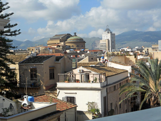 Die Besichtigung der Kirche ist kostenlos, doch wir spenden den vor der Kirche sitzenden Roma-Frauen etwas. Nachdem wir uns in der Kirche alles angeschaut haben, geht es zurück auf den Platz. Hier stellt Anneken fest, dass das Kaufhaus La Rinacente heute doch geöffnet hat, obwohl es eigentlich wegen Streik geschlossen sein sollte. Und so machen wir uns auf den Weg zur Dachterrasse. Von hier hat man einen herrlichen Blick auf die Chiesa San Domenico, die Piazza San Domenico, die Via Roma und über Palermo.