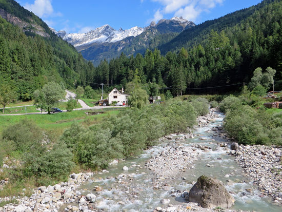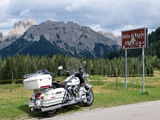 Über den Sella Ciampigotto, 1.790 m. Es ist sehr kalt dort oben, aber wir haben eine herrliche Sicht auf die Berge, teilweise mit Schnee bedeckt. Weiter mit vielen Kurven über Sella di Razzo, 1.760 m. Dort kurzer Halt. Zwei Jungen rufen uns zu, wir sollen nicht weiterfahren, sondern erst einmal bei ihnen einkaufen. Doch wir haben unseren Einkauf ja schon getätigt und so winken wir ihnen nur freundlich zu.