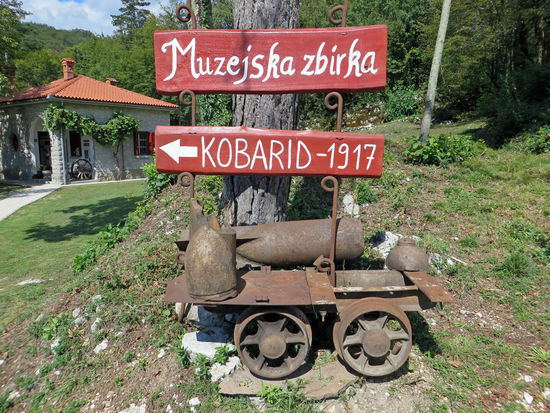 Hier befindet sich auch das größte Beinhaus italienischer Soldaten, die während des I. Weltkrieges auf slowenischem Gebiet gefallen sind. Zum Beinhaus und Kirche führt ein geteerter schmaler Weg mit Kreuzwegstationen, die hinter dem Portal am Hauptplatz von Kobarid beginnen. Die Stationen erinnern stark an die ästhetisierende Kunstform totalitärer Zeiten. Kobarid war zentraler Schauplatz der Isonzoschlacht 1917. Mit unfassbarer Grausamkeit metzelten sich Soldaten aus Italien und Österreich-Ungarn in zwölf Schlachten zwischen Juni 1915 und Oktober 1917 gegenseitig nieder. Die Eingänge der Untergrundschächte, die in den Berg gehauen wurden, um den Feind zu überlisten, sind stumme Zeugen des Irrsinns.
