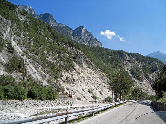 Um 10.30 Uhr erreichen wir Slowenien. Weiter über Bovec zum Passo de Predil. Der Predilpass, 1.156 m, führt durch eine wunderbare Landschaft, ist fahrerisch sehr abwechslungsreich (einige enge Kehren) und meist nur wenig befahren. Die umliegende Bergwelt der Julischen Alpen und das türkise Wasser des Flusses sind ein Genuss. Sehenswert sind die Festungen kurz hinter dem Predilpass.