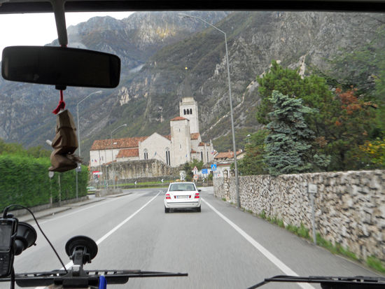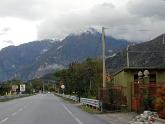 A 23 bis Osoppo Gemona. Um 15.35 Uhr verlassen wir die Autobahn, Kosten 15,90 Euro. SS 13. In Gemona kaufen wir noch schnell frisches Brot ein. Gegen 16 Uhr sind wir bei Venzone, auf den Bergen liegt Schnee – Bilder.