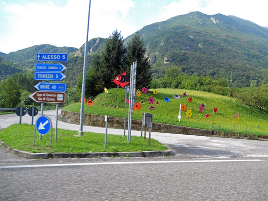 In Somplago finden sich am Kreisverkehr kleine bunte Fischskulpturen und ein Fisch klebt sogar oben am Berg. Ich finde das natürlich toll, Rolf meint, das interessiere keinen.