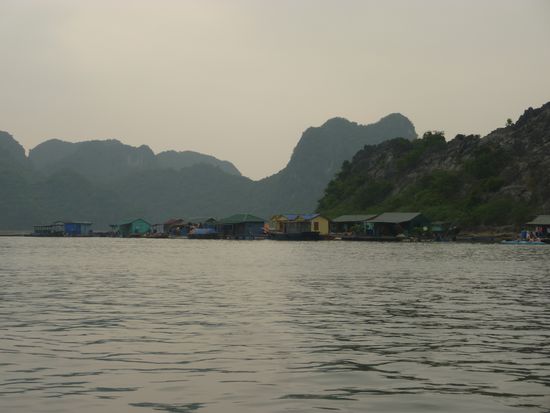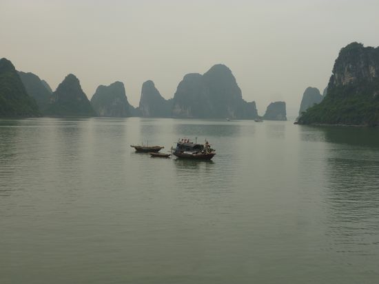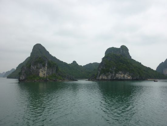 Mit meinem Gepäck machte ich mich auf den Weg zum Reisebüro. Ich war die Einzige, alle anderen Mitreisenden haben sich im Hotel abholen lassen. Ein Bus kam vorbei und mein Tour Guide Sun sammelte mich auf. Beim nächsten Halt stieg eine Frau ein; da Evelyn auch aus Deutschland kam machte uns Sun gleich bekannt. Am Hafen angekommen fuhr uns ein kleines Wassertaxi zu unserem Boot, dann gingen wir an Bord. Ein hübsches Boot, unten sind die Kabinen, darüber der Essbereich, oben das kleine Sonnendeck mit ein paar Liegestühlen. Evelyn hatte im Wassertaxi Lee aus England kennengelernt, der sich dann als mein Zimmergenosse herausstellte. Nach einem Tee bezogen alle ihre Zimmer, unsere Kabine war hübsch. Zuerst gab es einen kleinen Fehler und man wies uns das Zimmer mit Ehebett zu, aber Sun besorgte uns schnell das Richtige^^ Nach ein bisschen auspacken und quatschen gingen wir nach oben zum Lunch. Außer Evelyn, mir und Lee gab es noch eine kleine Männergruppe aus China, 4 Mädels aus Vietnam und ein russisches Ehepaar mit Tochter und ihrem vietnamesischem Freund. Nach dem Essen fuhren wir zur Cat Ba Insel, die einzig bewohnte in der Halong Bay. Dort angekommen besichtigten wir eine Tropfsteinhöhle, danach ging es zurück zum Boot wo wir auf dem Sonnendeck entspannten und ich eine Runde schwimmen gegangen bin. Nach ein paar Stunden relaxen und quatschen wurde das Abendessen angekündigt, ein super lecker Buffet mit allerlei Gerichten; Fleischspieße, ein köstlicher Krautsalat, Nudeln, Tofu, asiatische Austern, Reis, Gemüse und Frühlingsrollen. Den Abend ließen die Chinesen in ohrenbetäubender Lautstärke mit Karaoke ausklingen, das russische Ehepaar versuchte sich an squid fishing. Wir drei blieben noch bis 12 an Deck, dann gingen wir schlafen.