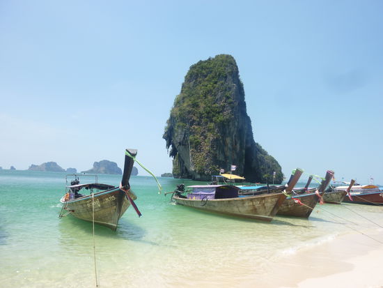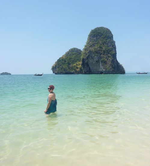 Am Phra Nang Beach kann man die Ebbe besonders stark spüren; vor der Bucht befindet sich eine große Kalksteininsel zu der wir mittags geschwommen sind, abends konnten wir sie dann zu Fuß erreichen. Natürlich war der Strand nie leer, aber er war auch nicht überfüllt, ab 16.00 aufgrund der einsetzenden Ebbe waren wir schon fast alleine
