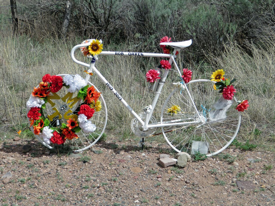 Am Parkplatz muss Rolf erst einmal unser Motorrad abtrocknen, dann fahren wir weiter, HW 527, HW 15 über Pinos Altos nach Silver City. Unterwegs sehen wir ein wunderschön mit Blumen geschmücktes Fahrrad – Erinnerung an Rob Oakes, 1942 – 2013. Vielleicht ist er an dieser Stelle verunglückt. Mich berühren solche Dinge immer sehr.