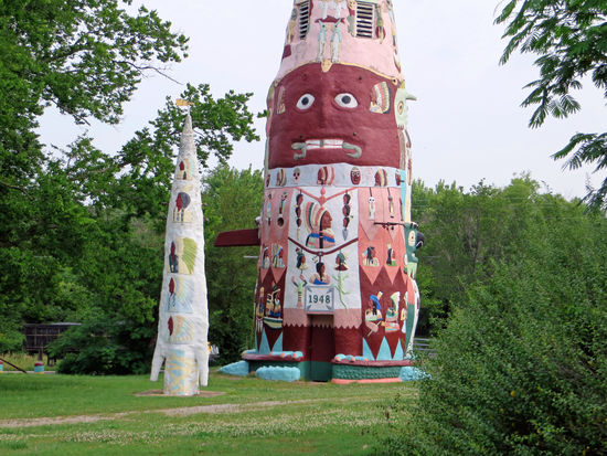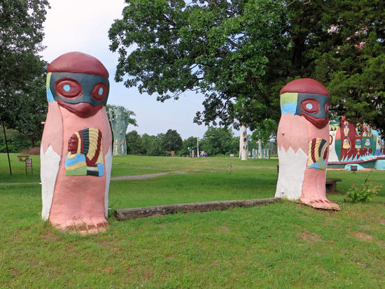 Es ist schon wieder sehr warm, besonders in den Lederklamotten. Wir machen nun einen Abstecher zu Ed Galloway’s Totem Pole Park. Zunächst finden wir den richtigen Parkplatz nicht, so dass Rolf mich absetzt, um das Motorrad irgendwo zu parken. Ich fühle mich jedoch ausgesetzt, muss ich doch in der Hitze dick angezogen für meine Verhältnisse viel zu weit laufen. Ich bin fix und alle, als ich endlich zum Eingang des Parks gelange.
