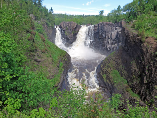 Wir parken unser Motorrad in der Nähe des Visitor Center und laufen ca. 15 Minuten zu den High Falls. Hier stürzen die Wasser des Pigeon River 36 m in die Tiefe. Gewaltig und laut, denn in diesem Jahr führt der Fluss viel Wasser.