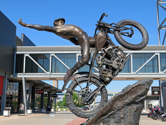 Uns beeindruckt auch die Bronze-Skulptur des „Hill Climber“, 4,9 m hoch, erschaffen von Jeff Decker, einem Künstler aus Utah, Historiker und Harley-Enthusiasten. Die Skulptur zeigt einen Vintage Harley Fahrer auf einem himmelwärts ragenden DAH Bike, eines von nur 6 in der Welt. Die Figur ist frei von Furcht: ein Fuß ist vom Motorrad genommen und der rechte Arm zeigt nach rückwärts.