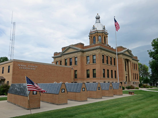 In Hillsboro sticht uns das Traill County Courthouse, 1905 in Beaux-Art errichtet, ins Auge. Wir halten und wollen es uns anschauen. Das Gebäude gehört zu den National Register of Historic Places.