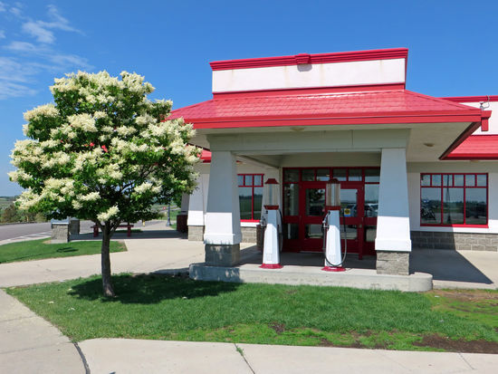 Pause um 11.30 Uhr an einer Raststätte, die aussieht wie eine alte Tankstelle.