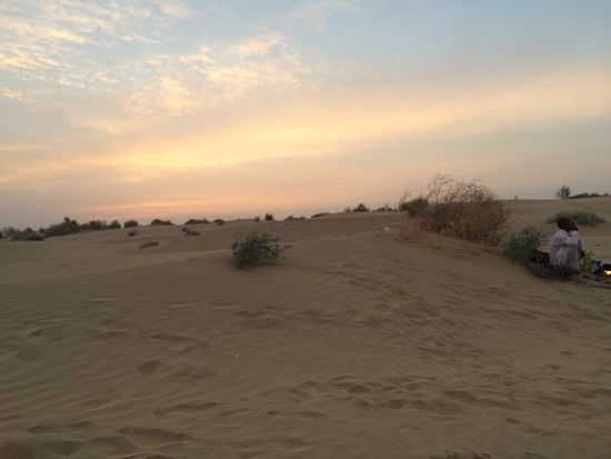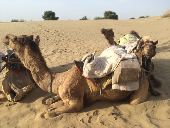 Wir halten in Barna, einem Wüstendorf, trinken einen Chai mit der Familie unseres Guides Abai, dem Onkel von Ba. Dann werden die Kamele gesattelt und mit Verpflegung und Decken gepackt. Walli reitet Michael, Abai sitzt auf dem Kamelboss Mahendra, ich selbst habe Raju unter mir, Papiya begleitet uns als Ersatzkamel. Wir reiten los, sehen kleine Eidechsen, wilde Kamele und Antilopen. Nach einigen Kilometern erreichen wir ein schönes Dünenareal, sitzen, satteln und laden ab. Abai sammelt Feuerholz und bereitet einen Begrüßungschai und Fingerchips für uns zu. Sehr romantisch! Es folgen: Sonnenuntergang, Abendessen (ich schäle Gurke und Kartoffeln und versuche mich - eher erfolglos - im Chapati formen), eine nächtliche Dünenwanderung bei hellem Fast-Vollmond, Sterne gucken, interessante Einblicke in die rajasthanische Wüstenkultur durch den gut Englisch sprechenden Abai, der eine kleine Yoga-Vorführung und Mini-Lesson (Ushtrasana - das Kamel ... versteht sich) und das Aufschlagen des Nachtlagers. Die Nacht unter freiem Himmel in der stillen Wüste zu verbringen hat schon einen besonderen Charme. Zum Sonnenaufgang sind wir wach, es ist recht kühl und windig, dann: Frühstück, Kopfstand, Dünenspaziergang, Kamele einsammeln, Kopfmassage ( für die Kamele), satteln, Fotosession mit Kamelen und Rückritt inklusive Racingphasen (Yeah!). Das war ein lohnender Trip. Wir kommen glücklich, paniert und laut Ba und seiner französischen Freundin 20 Jahre jünger aus der Wüste zurück.