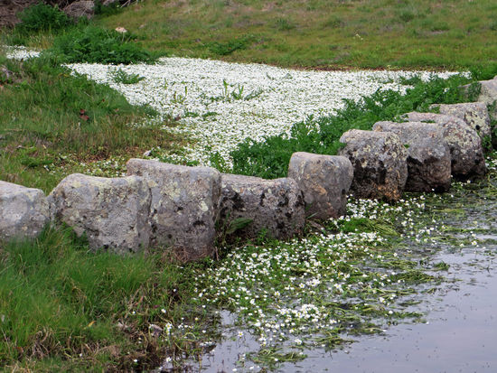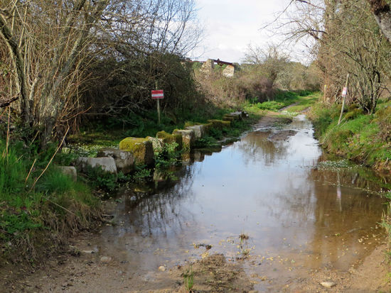 Zuvor passierte ich im Tal die schöne Ponte Romana über den Ribeira de Nisa. Die Brücke besitzt vollkommene Brückenbögen. In Pe da Serra entschloss ich mich, da das Wetter zunehmend schöner wurde, dem im Buch beschriebenen Weg zu folgen und nicht dem mit gelben Pfeilen markierten Weg. Ich habe es nicht bereut. Der Weg war wunderschön und verlief lange Zeit am aufgestauten Rio Tejo entlang.