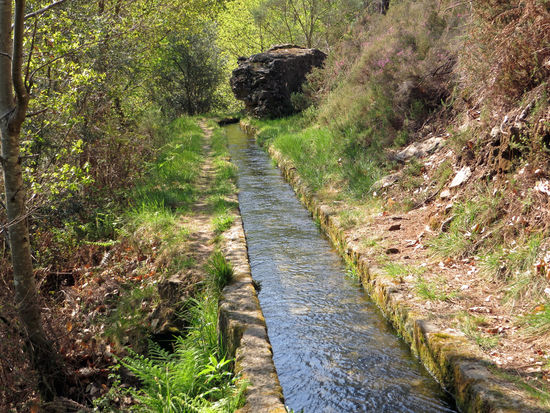 Die Pfeile führten mich zur Levada de Piscaredo, wo ich dann dem PR2 folgte. Er führt 8,8 km entlang der offenen Wasserleitung nach Mondim de Basto. Ein herrlicher Waldweg, auf dem man allerdings aufpassen muss, denn links ist ein Wildbach und rechts die Wasserleitung. Der Weg ist dort teilweise sehr schmal. Doch mir machte es großen Spass, hier zu wandern – auf der einen Seite das Plätschern der Wasserleitung und auf der anderen Seite das Tosen des Wildbaches.