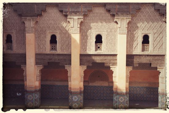 Jedenfalls wollten wir schnellstmöglich noch einmal zur Koranschule Ben Youseef, da diese gestern praktisch von Touristen überrannt wurde und auf fast jedem zweiten Bild irgend ein dickes Kind seinen Kopf ins Bild streckte oder eben andere Touristen die ebenfalls wild am knipsen waren zu sehen waren. Das ist das Kreuz mit den Touristen: Man ist selber einer, hofft aber immer das keine Anderen da sind und man den Platz oder das Gebäude für sich alleine geniesen darf. Da wir aber schon um 9:30 Uhr dort aufschlugen hatten wir tatsächlich Glück und kaum mehr als 10 Touristen standen im Innenhof. Also hab ich geknipst was das Zeug hergab. Für Ira gabs ein extra Fotoshooting und somit waren wir beide glücklich. Ira von vorne, Ira im Fenster, Ira im Profil, Ira sexy - meine Frau kann praktisch alles! Ich hatte Spass - Ira auch. Ceck, erledigt.