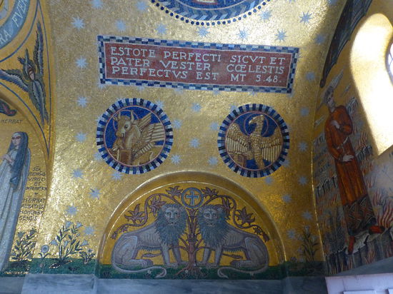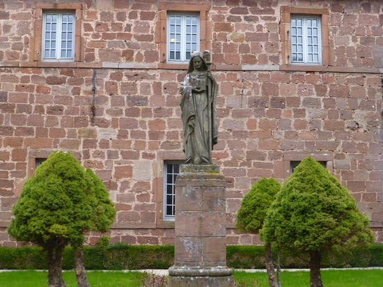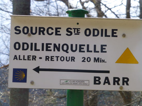 Auf dem 763 Meter hohen Odilienberg weht uns ein ziemlich frischer Wind um die Nase. Weil die Belegung der Parkplätze bereits auf einen regen Besucherandrang schließen lässt, beginnen wir unsere Besichtigung zunächst mit einem Spaziergang hinunter zur Odilienquelle. Vorbei an einem Kreuzweg, bei dem die Stationen farbenprächtig auf der Felswand angebracht sind, geht es etwa 10 Minuten lang bergab. Dann erreichen wir eine gefasst Quelle, an der sich bereits einige Pilger und Wanderer ihre Wasserflaschen füllen. Der Sage nach soll Odilia eines Tages, als sie vom Kloster Niedermünster zur Hohenburg hinaufstieg, hier einem blinden Bettler begegnet sein. Mitleidig klopfte Odilia mit einem Stock an einen Felsen, woraufhin das Wasser zu fließen begann und den Bettler von seiner Krankheit heilte. Seit dem Mittelalter wird Odilia deshalb auch als Schutzpatronin der Blinden und Augenkranken verehrt.