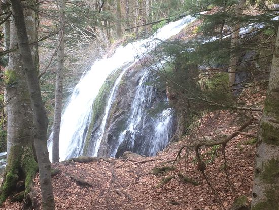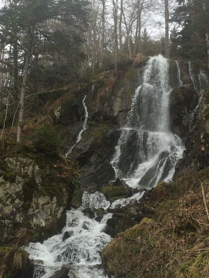 Die Klosterkirche können wir leider nicht besichtigen, da hier gerade noch ein Ostermontags-Gottesdienst statt findet. Wir fahren deshalb weiter nach Le Hohwald, einem Hochplateau in den Vogesen mit wunderschönen, alten Häusern. Wir stellen unser Auto bei der Mairie ab und starten zu einer kleinen Rundwanderung. Entlang der Andlau gelangen wir zunächst zum "Cascade du Hohwald" - dem Wasserfall der Andlau. Das Flüsschen stürzt sich als imposanter Wasserfall vom Plateau Champ du Feu hinunter ins Tal.