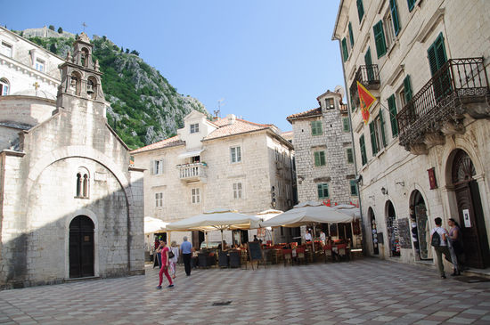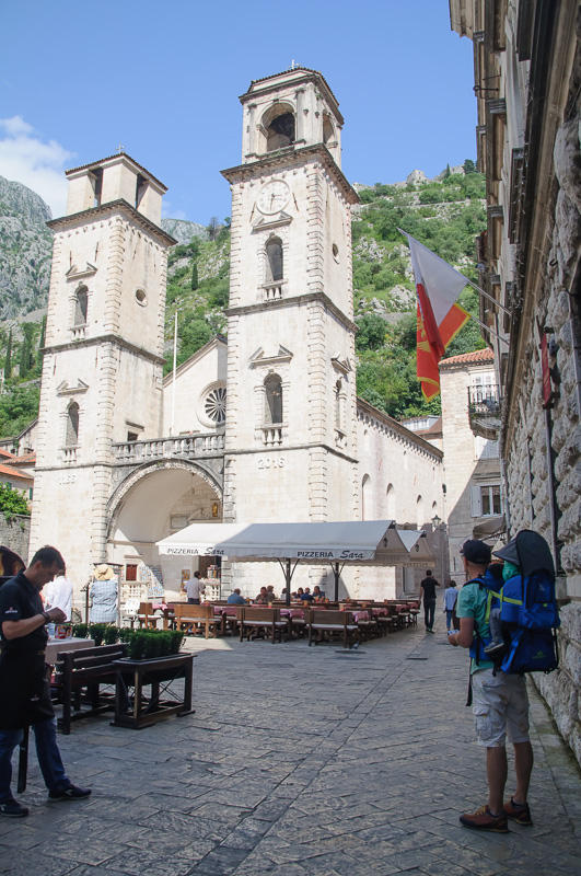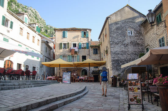 Kotor muss man sich dann aber natürlich auch noch ansehen. Es ist eine wunderschöne Stadt, klein und verwinkelt, und ohne Autoverkehr in der Altstadt. Sie gehört zum Unesco Weltkulturerbe und steht auch auf dem Ausflugsprogramm von ziemlich vielen Rundreisen und Kreuzfahrtschiffen, was man an den Touristen gemerkt hat. Vor allem war es dann nach 5 am Nachmittag plötzlich sehr ruhig und friedlich, nachdem die Reisegruppen wieder weg waren. Wir sind noch ein wenig durch die Stadt geschlendert, haben uns eine Pizza und ein Glas Wein gegönnt und dann auch wieder zum Campingplatz zurück gefahren. Für den Rundweg über die Festungsmauern, der sicher tolle Aussichten auf die Bucht und die Stadt erlaubt, fehlte uns dann ein wenig die Zeit und nach dem Wein wahrscheinlich auch ein bißchen die Motivation.