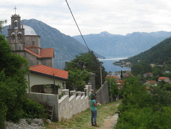 Perast haben wir uns dann auch noch angesehen, nachdem wir am nächsten Tag gemütlich einen Spaziergang durch Morinj gemacht haben. Da ist uns auch zum ersten Mal so richtig aufgefallen, wie viele Resorts und Villen da überall gebaut werden. Ob das für reiche Montenegriner oder eher ausländisches Zielpublikum ist, wissen wir nicht, aber die Gegend scheint so richtig zu boomen. Das Bild hat sich dann in Perast noch bestätigt, wo viele Häuser tiptop renoviert sind, oder gerade im Villenstil neu aufgezogen werden. Wir haben das Auto nicht auf einem der 2 offiziellen Parkplätze abgestellt, weil da 5 Euro pro Stunde Parkgebühr fällig geworden wäre. In Montenegro fällt ein Wohnmobil anscheinend in die Kategorie Minibus, und ist somit zehn mal so teuer wie ein PKW. Die Stadt ist schön aber nicht gross, so ist man schnell durch. Was auch noch sehenswert ist sind 2 Inseln mit Kirchen. Zu einer der beiden sind wir mit dem Boot hingefahren und haben uns die Seefahrerkirche angesehen. Danach haben wir noch ein paar Palatschinken verdrückt, während sich Georg auf dem Spielplatz des Restaurants ausgetobt hat.