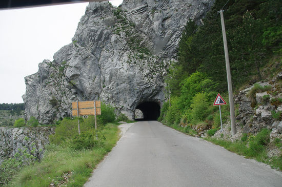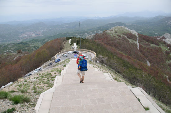 Die Strasse wird dann aber wieder flacher und auch besser, und man fährt gemütlich durch den Nationalpark. An der Strasse tauchen immer wieder kleine Stände auf, wo dann in der Saison der für Njegusi typische geräucherte Schinken verkauft wird. Jetzt haben die aber alle noch zu, oder nur zu den Tourbussen auf, wir wissen es nicht. Dann führt die Strasse bis kurz vor das Mausoleum. Ein letzter Tunnel mit gut 400 Stufen trennt uns vom Gipfel, und Georg merkt beim Durchgehen natürlich das Echo und schreit und quietscht so laut es geht. Von oben hat man dann einen beeindruckenden Ausblick, aber leider war das Wetter nicht optimal und die Fernsicht nicht gut. Und kalt war es dort oben, sogar ein paar Überreste von Schnee haben wir noch gefunden. Georgs Kommentar: „Snee, nass“. Das „Sch“ müssen wir noch üben.