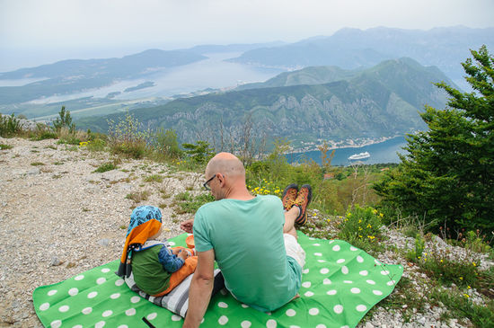 So ganz sicher waren wir uns bis zuletzt nicht, ob wir in den Lovćen Nationalpark rauffahren sollen oder nicht. Nicht weil uns der Park und das Njegoš Mausoleum nicht interessiert hätte, aber für das Auto sind 1600 Höhenmeter doch eine ziemliche Tortour. Aber nach „Motor super super“ hat dann doch der Optimismus in uns gesiegt und wir habens versucht. Also zuerst nochmal nach Kotor und dann die Strasse hoch, man gewinnt sehr schnell an Höhe, und hat immer wieder wunderbare Aussichten auf die Bucht von Kotor und Luštice. Serpentinen noch und nöcher, aber kein Problem. Dann plötzlich Gegenverkehr, ein Reisebus. Also mussten wir zurückschieben bis zu einer Ausweichbucht und den Bus passieren lassen. Für Bus und Wohnmobil nebeneinander reicht die Serpentinenstrasse dann doch nicht aus. Kurz vor Njegusi kommt dann die Abzweigung in den Nationalpark. 2 Euro Nationalparkticket pro person ist ein Schnäpchen, also rein. Und hier wurde die Strasse dann doch ein wenig abenteuerlich. Schmal, viele Schlaglöcher, also nur im 1. und 2. Gang und sehr steil. Da wurde der Motor dann doch ein wenig fiebrig, und wir haben ihm und uns eine kleine Mittagspause gegönnt. Aber an einer super location mit Ausblick!