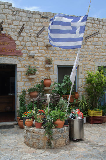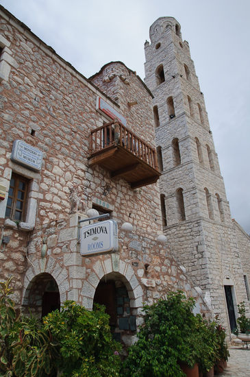 Viel Betrieb ist in dem Ort nicht, ab und zu fährt ein Mietauto mit Touristen durch, aber sonst ist es sehr ruhig. Da geht es sich dann sogar aus, dass Georg einen Gockel quer über den Dorfplatz treiben kann. Wir haben dann noch Thymianhonig gekauft, sind eine Runde durchs Dorf spaziert und haben uns das erste Mal die Wehrturmhäuser für die diese Region berühmt ist, aus der Nähe angesehen.