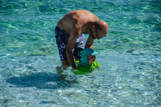 Nach der Fahrerei der letzten Tage war wieder ein wenig Ruhe notwendig, und so haben wir uns dann auf nach Gythio gemacht, wo wir am Gythio Bay Campingplatz ein paar Tage verbracht haben. Baden, ein wenig faulenzen, ein wenig ausspannen. Und einen Pool gibt es dort auch, wo Georg dann draufkommt, dass man von draussen reinhüpfen kann. Gottseidank hat er gleich verstanden, dass er das nur darf wenn entweder Mama oder Papa im Wasser sind. Plantschen im Pool war jedenfalls für ihn der Hit. Und Georg kommt drauf, dass er untertauchen kann. Er hält dabei sogar die Augen offen und hat einen wahnsinnigen Spass dabei.