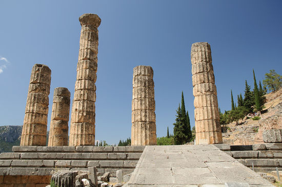 Die Lage von Delphi ist spektakulär. Die Stätte ist in einen steilen Berghang hineingebaut und erstreckt sich über 300 Höhenmeter am Hang.