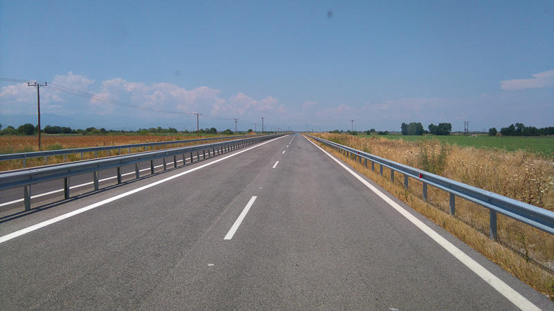 Von Delphi fahren wir über Amfissa und einen Pass in den Bergen nach Lamia, und weil Georg noch gut im Kindersitz schläft, sind wir gleich weitergefahren Richtung Norden. Lamia war eigentlich als Mittagsstop eingeplant, aber so haben wir die ein wenig verschoben. Nach Lamia beginnen wieder die Äcker, nachdem auf dem ersten Stück in den Bergen nur Wälder und eine riesige Bauxitmine zu sehen waren. Stehengeblieben für einen Kaffee sind wir dann in Domokos. Ein Ort im Nirgendwo, aber er liegt ein wenig exponiert auf einer Anhöhe, und man kann sehr gut die Ebene sehen, die wir nach Karditsa und Trikala durchqueren werden. Schnurgerade führt die Strasse dann auch durch grosse Landwirtschaftsflächen, links und rechts der Strasse Äcker soweit das Auge reicht. Etwas langweilig, aber man macht wenigstens viele Meter.