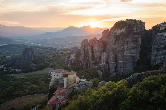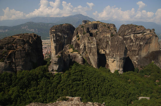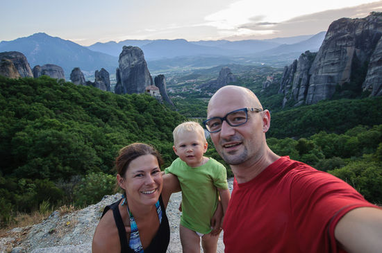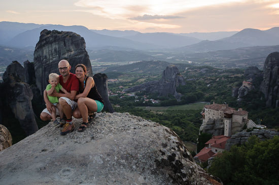 Vom Aussichtspunkt beim Varlaam Kloster hat man eine beeindruckende Sicht auf das Kloster Russanou und die Felsen dahinter. Rechts oben im Bild steht übrigens Markus mit Georg.