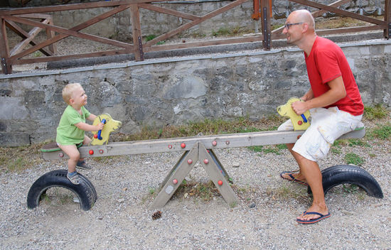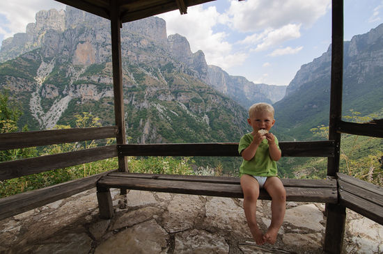 Wir haben also in Meteora unsere Siebensachen eingepackt und uns weiter auf den Weg in den Norden gemacht, Vikos Schlucht hiess das heutige Ziel. Die liegt im Pindos Gebirge in der Region Zagorohoria, genauer gesagt zerteilt sie den Aoos-Vikos Nationalpark in der Mitte, und ist mit einer Tiefe von 900 Metern eine der tiefsten Schluchten der Welt. Laut Guinness Buch ist sie die tiefste im Verhältnis zu ihrer Breite. Ursprünglich haben wir überlegt, auf dem Weg dorthin über den 1700 Meter hohen Katarapass nach Metsovo zu fahren, aber das wollten wir dann dem Ducato doch nicht antun. Der Weg von Meteora zur Autobahn war schon beschwerlich genug, da haben wir dann auf die zusätzlichen 700 Höhenmeter verzichtet und sind durch die Tunnelkette der Autobahn nach Metsovo gefahren. Eigentlich sollte der Ort direkt an der Abfahrt liegen, aber man muss doch noch einmal 300 Höhenmeter nach oben fahren bis man zum Dorf kommt. Metsovo hat uns aber mit der originalen Architektur gut gefallen. Nach einer Mittagspause an einem ruhigen Ort neben einer Kirche ein wenig ausserhalb des Zentrums sind wir dann noch ein wenig durch den Ort spaziert, haben Kaffee getrunken und Georg hat sein obligatorisches Schaukelpensum hinter sich gebracht. Diese Routine haben wir schon ganz gut drauf.