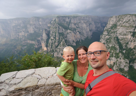 Dann sind wir weiter über die Autobahn nach Ioannina gefahren, von dort dann nach Norden, ein, zweimal abgebogen, und über die Berge bis nach Monodendri, einem der Orte direkt an der Schlucht. Wir sind aber nicht direkt im Ort stehengeblieben, sondern gleich noch ungefähr 6 Kilometer weiter nach oben zum Oxia Aussichtspunkt, dem sogenannten Vikos Balkon. Raus aus dem Auto und die letzten Meter zur Schlucht, und es ist mit Worten schwer zu beschreiben, welches Gefühl man da hat. Zuerst geht man auf einem Weg durch den Wald, dann um eine enge Kurve, und plötzlich geht es vor einem fast 700 Meter nach unten. Wir haben auf dieser Reise schon so einige Schluchten gesehen, aber das schlägt wirklich alles um Längen. Nach einem kurzen Abendessen im Auto und einem heftigen Gewitter sind wir zum Sonnenuntergang gleich nochmal zum Aussichtspunkt. Geschlafen haben wir dann gleich da oben am Parkplatz, wir waren die einzigen und es war wunderschön ruhig. Und vor allem war es nach den letzten heissen Wochen, die wir in Griechenland hatten, hier auf 1200 Metern Seehöhe endlich wieder einmal angenehm kühl.