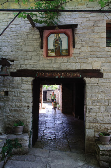 Wir sind dann am Vormittag wieder runter gefahren nach Monodendri, wobei wir noch eine Anhalterin mitgenommen haben. Sie war eine Schafhirtin, geschätzt 80Jahre alt, hat aber ein paar Brocken Deutsch gekonnt. Woher, haben wir dann aber nicht rausgefunden. Monodendri ist ein kleiner verschlafener Ort,der noch aus den traditionellen alten Steinhäusern besteht. Ein paar Hotels und Restaurants gibt es, man sieht auch einige wenige Touristen. Wir sind noch die paar hundert Meter zum Kloster Agia Paraskevi an den Klippen gegangen, und haben noch einmal die Aussicht in die Schlucht genossen.