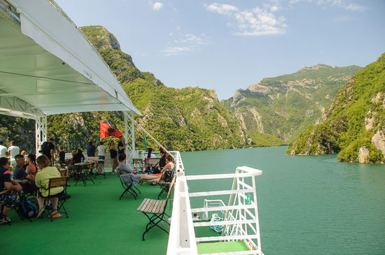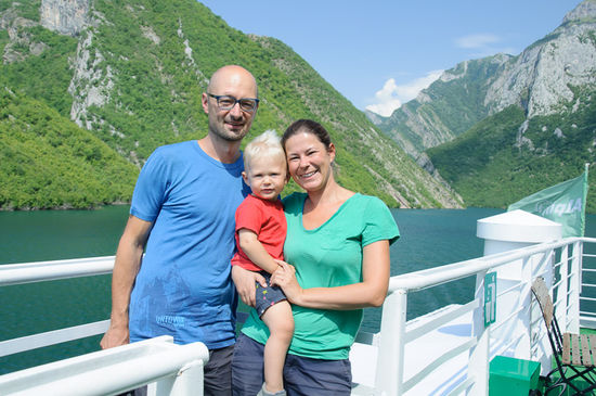 Sehr schön, wahrscheinlich die schönste Schifffahrt, die wir je gemacht haben. Man hört ja vorher so einiges, norwegische Fjorde am Balkan zum Beispiel, und die Realität schaut wirklich so aus. Aber bevor es losging muss man erst über den abenteuerlichen Anleger auf die Fähre kommen. Und davor wird einem vom Besitzer des kleinen Cafes noch 200 Lek fürs „Parken“ abgenommen. Wir haben das Wohnmobil ohne Probleme auf die Fähre gebracht, und uns gemütlich aufs Deck gesetzt. Die Fähre fährt los, aber dann kommen noch vier Autos daher, die offensichtlich noch mitfahren wollen. Also wird nochmal umgedreht und angelegt, allerdings an einer Stelle, die eigentlich nicht so richtig dafür vorgesehen ist. Damit die Autos rauffahren können, muss noch mit vereinten Kräften ein wenig Erde auf die Seite geschaufelt werden, aber es sind doch einige Euros, die die Fährgesellschaft dadurch an Mehreinnahmen hat. Und anscheinend zahlt sich das Schaufeln da aus.