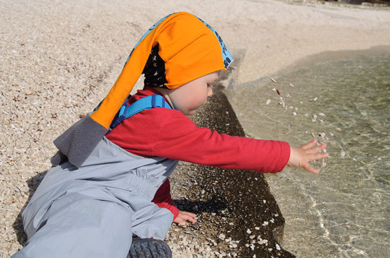 Der letzte Tag hat uns dann Sonnenschein gebracht, und Georg durfte das erste mal ins Meer. Zwar nur im Sitzen und das Wasser bis zu den Knien, aber immerhin. Das Wasser ist einfach noch zu kalt, und weiter als bis zu den Knöcheln will man da eigentlich nicht rein. Die Schlechtwetterfront der letzten Tage hat sich leider ziemlich auf die Wassertemperaturen ausgewirkt. Georg war aber trotzdem restlos begeistert, und seither will er vom Wasser gar nicht mehr weg. Die Worte "Meer", "Wasser", "Boote", "aussi" sprudeln abwechselnd aus ihm heraus. Müssen wir dann doch einmal vom Meer weg, haben wir es mit einem protestierenden Rumpelstilzchen zu tun. Oft hilft nur die Ablenkung mit Essen, das funktioniert noch ganz gut.