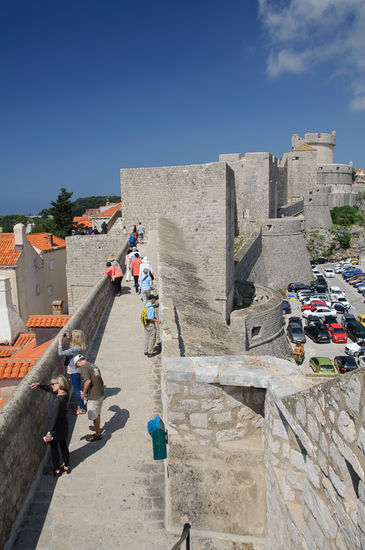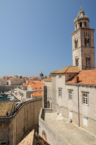 Wir haben die Trage dabei gehabt und uns deshalb auch mit Georg auf den Rundweg über die Festungsmauern gemacht, was die Strapazen des Tragens aber hundertmal wert war. Die Ausblicke in die engen Gassen und Innenhöfe sind traumhaft, man kann über die Mauern schlendern und den Blick über die Dächer der Stadt und das Meer schweifen lassen, allerdings nur gegen den Uhrzeigersinn, alles schön reglementiert. Wir haben beim Stadttor auch die Einbahnschilder stehen sehen, mit denen die Touristenströme in der Hauptsaison geleitet werden, aber die wurden gottseidank noch nicht gebraucht. Eine gute Stunde hat der Rundweg dann doch gedauert, bis wir wieder am Startpunkt waren und uns ein Restaurant zum Mittagessen gesucht haben. Und wenn man da die Gegend um die Hauptstrasse und den Hafen vermeidet sind sogar die Preise in Ordnung.