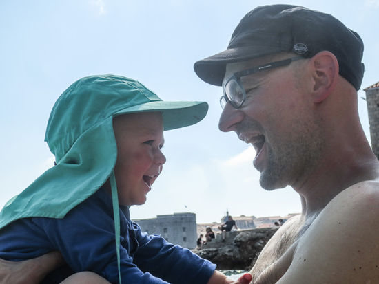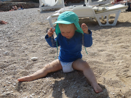 Wir sind dann nochmals durch die engen und schattigen Gassen geschlendert und nach ein wenig ziellosem Flanieren aus der Altstadt wieder raus, weil wir erstens schon einiges gesehen hatten, und alles, was irgendwo drinnen ist, mit relativ saftigen Eintrittspreisen zu bezahlen ist. Und Museum mit einem Eineinhalbjährigen funktioniert sowieso nicht. Dazu kommt noch dass Georg an jeder Ecke das Meer gesucht hat, also ab zum Strand, und der ist überraschend schön. Es war ein heisser Tag, nur hatten wir leider unsere Badesachen nicht dabei, und wir konnten nur die Zehen ins Meer halten. Trotzdem ein toller Ausklang für einen schönen Tag. Ach ja, zurück am Campingplatz ist dann Georg auf einmal ohne Hilfe die Stiege zu den Duschen raufmarschiert. Da passiert im Moment wirklich jeden Tag etwas.