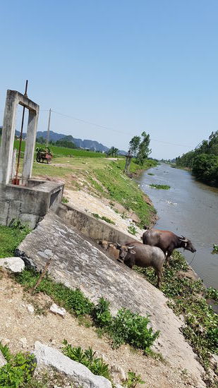 Danach sind wir querfeldein noch ein wenig durch Reisfelder und Dörfer gefahren, bevor es zurück nach Tam Coc ging. Dort wollten wir eigentlich eines der Ruderboote besteigen, hatten jedoch das Gefühl, die ganze Strecke bereits mit den Rädern abgefahren zu sein und mit den Booten nicht viel mehr sehen zu können. Somit haben wir uns dagegen entschieden und lieber im Schatten eine Eispause eingelegt, bevor wir zurück Richtung Hotel gefahren sind. Die Rückfahrt wurde extrem lang, denn wir haben uns völlig verfahren und sind durch Reisfelder, in Dörfer die nur einen kleinen schmalen Sandweg als Strasse haben und querfeldein durch die Wallachhei geradelt. Wir brauchten locker 2 Stunden zurück, was bei der Hitze zu lang war. Aber die Tour war grossartig und wir sind nicht nur von der wunderschönen Landschaft angetan, sondern ganz besonders von den Einwohnern Ninh Binhs. Die Menschen hier sind so freundlich, wie wir es noch nirgendwo auf unserer Reise erlebt hatten. Auch hier scheinen wir wieder aufzufallen ausserhalb des TouristenHotSpots Tam Coc. Die Erwachsenen und Kinder haben gewunken und gerufen, wenn wir mit unseren Rädern an ihren Häusern vorbei gefahren sind. Eine solche Fremdenfreundlichkeit und auch Hilfsbereitschaft hätten wir in einem Land, das durch die westliche Welt so viel Leid erfahren hat, nie erwartet.